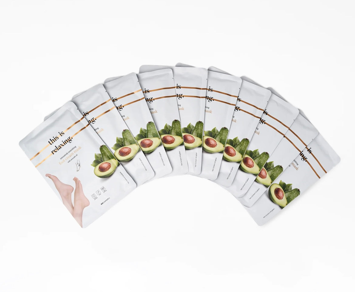 Voetverzorgingsmasker met avocado-extract, een rijke bron aan vitaminen en mineralen. Aanbevolen voor voeten die intensief en langdurig gehydrateerd moeten worden. Bevordert de regeneratie van de huid en reduceert tekenen van veroudering, waardoor de huid er jonger, gladder en gevoed uitziet. Het masker bevat waardevolle ingrediënten, zoals laagmoleculair hyaluronzuur, vitamine E, allantoïne, druivenpitolie, bernagiezaadolie, vitamine B3 en ureum.